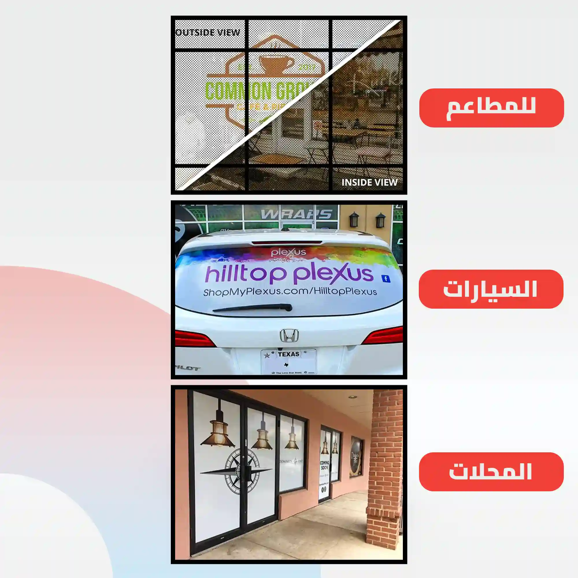 - واجهات المباني الزجاجية: تحويل واجهات المحلات والمكاتب إلى مساحات إعلانية جذابة مع الحفاظ على الرؤية من الداخل.